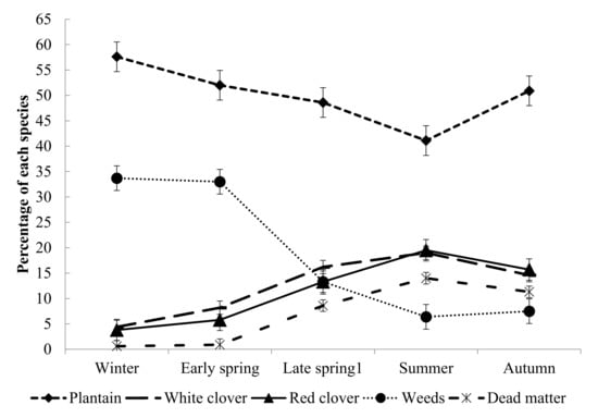 In early spring, lambs exhibited a greater (p < 0.05) selection of plantain than white clover (Table 4). The selection of red clover did not differ (p > 0.05) from either plantain or white clover in early spring. There were no differences (p > 0.05) in the selection between species during late spring. During summer, lambs exhibited a greater (p < 0.05) selection of plantain and red clover than of white clover. The selection of plantain and red clover did not differ (p > 0.05) in summer. Lambs exhibited a greater (p < 0.05) selection of red clover than plantain and white clover during autumn. There was no difference (p > 0.05) in selection of either plantain or white clover during autumn.