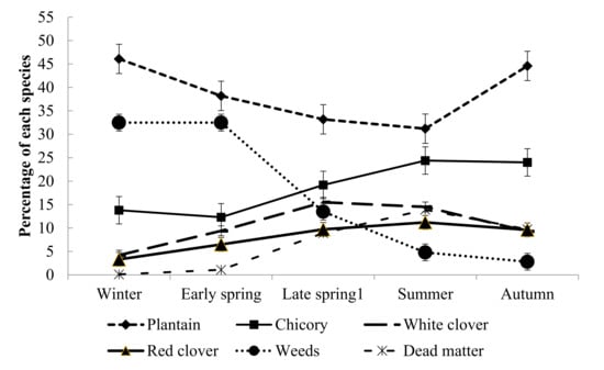 - Somasiri, S.C.; Kenyon, P.R.; Kemp, P.D.; Morel, P.C.H.; Morris, S.T. Seasonal influence on botanical composition of plantain, chicory, white-and red-clover based herbage mixes. In 23rd International Grassland Congress; Roy, A.K., Kumar, R.V., Mahanta, S.K., Das, M.M., Agrawal, R.K., Singh, J.B., Dwivedi, K.K., Prabhu, G., Shah, N.K., Eds.; Range Management Society of India, ICAR-Indian Grassland and Fodder Research Institute: New Delhi, India, 2015; pp. 96–97. [Google Scholar]