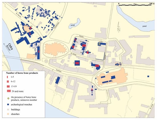 During the archaeological research conducted so far at Ostrów Tumski, over 100 items made of horse bones have been identified (about 12% of all bone and horn products). They were found in the wide-area trenches in the eastern, larger part of the stronghold, in groups of several dozen artefacts [25,26,27,28]. They are less common in the western part of the complex (castrum minus).