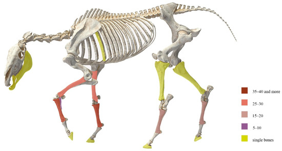 In archaeozoological practice, the most common study materials are the post-consumption remains of domestic animals, which constitute the overwhelming majority of bone remains with determined species and anatomical affiliation [5,6,7,8]. The bone remains of horses usually do not exceed 4% of NISP(the number of identified specimens), and in the distribution of anatomical elements a deficiency of skeletal elements of limb distal parts is observed, which is often interpreted as a result of their acquisition as a raw material. Much less often the bone remains are found in an anatomical order (articulated skeletons), which is mainly related to ritual burials [9], or the decomposition of the animal carcass on the so-called knacker’s yards [10]. All kinds of pathological changes associated with diseases that give visible changes in the bone tissue [11] are very interesting for the researchers. In the case of horses, they most often result from the improper use of animals and mainly concern the musculoskeletal system [12,13].