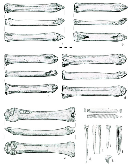 The so-called spikes were also created from horse skeletal remains. They were universal items that could be used for piercing, knitting, engraving, and many other things. The raw material used for making them was also varied, including horse’s splint bones (the second and fourth metacarpal or metatarsal bones), although such items were not common in the studied collection [25,26,27,28,38]. Eight such artefacts were identified in Ostrów Tumski (Figure 3g–i), with the usage rate ranging from 100:4.55 to 100:5.17 [26]. It is possible that splint bones were obtained while processing the nearby metapodia (Figure 2 and Figure 3). Therefore, among the parts of a horse skeleton, long and straight bones were preferred for tools (Figure 2). This is consistent with the results of studies from other sites [25,26,28,29,30,31,32,33,34,36,37,38,39,40].