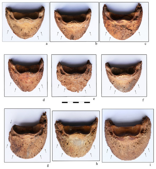 Wroclaw Ostrów Tumski. Horse distal phalanx with a removed hoof capsule (a–i), arrows indicate the traces of cutting the entire distal part (solear margin) of the ungular (coffin) bone.