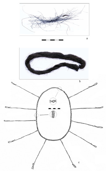 Horsehair also had its application. To this day, it is used to produce brushes. Moreover, the bristle of horses and other animals was used in tanning and as a filling for pillows, mattresses, etc. [50,54]. In the Wroclaw stronghold, it was found in pits used for tanning [55]. Interestingly, horsehair often accompanied skates made of horse bones (Figure 5a) [55]. This could indicate the comprehensive processing of all available types of horse raw material in one place. Instrument strings and cords were also made of horsehair [54] and the latter was excavated in Ostrów Tumski (Figure 5b) [56]. A decorative braid described as a horsehair necklace was also found (Figure 5c) [57]. This kind of braid, sometimes interpreted as a wreath, is also known from other sites in Poland. Apart from being a decoration on its own, it is also thought to have apotropaic as well as purely practical functions, as a string for an ornament or amulet [39].