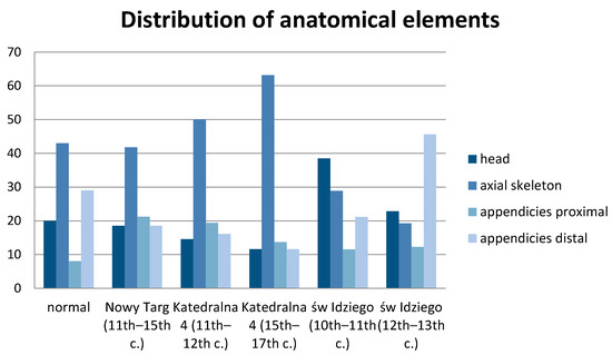 The distribution of anatomical elements of horses in the chosen archaeological sites in Wroclaw. Normal—Normal Distribution of Anatomical Elements; c—century.