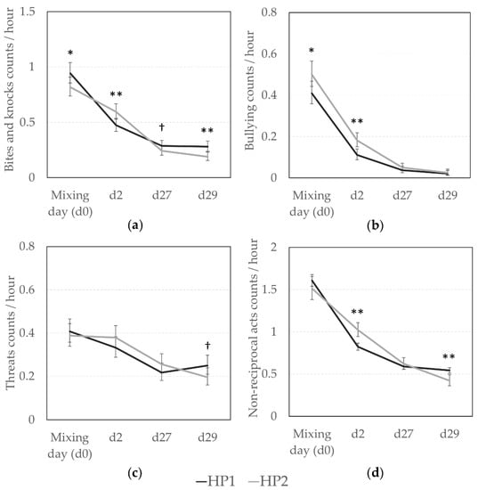 Non-reciprocal agonistic behaviors according to the genetic line (HP1, HP2). Back-transformed predicted mean (CI) number of (a) bites and knocks, (b) bullying, (c) threats, (d) total non-reciprocal acts (bites, knocks, bullying, and threats) given per hour at d0 (mixing), d2, d27, and d29. *, **; Means differ significantly (* p < 0.050, ** p < 0.010); † Means tend to differ (p < 0.10) between genetic lines for a same observation day.