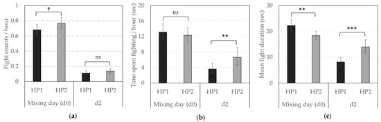 Reciprocal agonistic behaviors according to the genetic line (HP1, HP2). Back-transformed predicted mean (CI) (a) number of fights per hour, (b) time spent fighting per hour (in sec) and (c) average fight duration (in sec) on d0 (mixing) and d2. **, ***; Means differ significantly (** p < 0.010, *** p < 0.001); † Means tend to differ (p < 0.10) between genetic lines for a same observation day; ns—not significant.