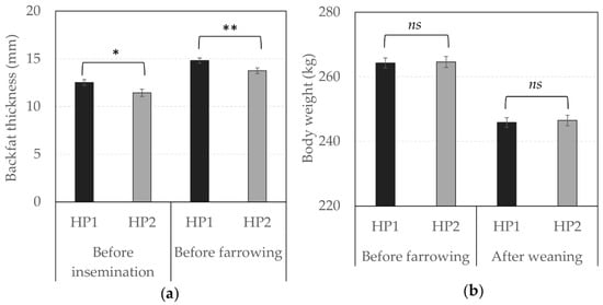 Individual performance according to genetic line. Average (± SEM) (a) backfat thickness (in mm) before insemination and before farrowing and, (b) body weight (in kg) before farrowing and after weaning in HP1 and HP2. *, ** Means differ significantly (* p < 0.050, ** p < 0.010) between genetic lines for a same recording phase; ns—not significant.