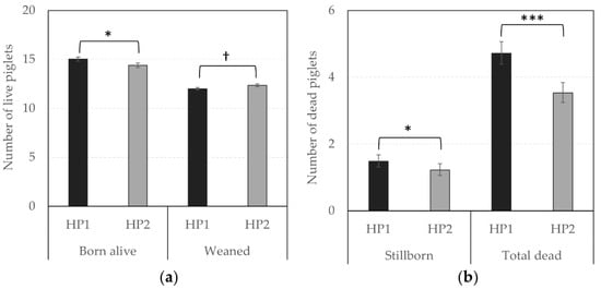 In terms of reproductive performance, the probability of success to farrowing tended to be higher for HP1 than for HP2 sows (OR = 1.31 vs. 1.00, respectively, F1,1238 = 3.66, p = 0.056), indicating that the risk to be removed from the group due to health issues or gestation failure tended to be lower for them. In addition, Figure 4 and Figure 5 illustrate significant differences between offspring of both genetic lines. HP1 sows had bigger litter sizes (i.e., number of alive piglets at birth, F1,225 = 4.21, p = 0.041) but their piglets were lighter than piglets from HP2 sows (F1,224 = 25.66, p < 0.0001), so that the litter weight did not differ between both genetic lines (p > 0.10). Nevertheless, HP1 sows had a higher number of stillborn (F1,225 = 4.07, p = 0.045) and total dead (F1,203 = 28.09, p < 0.0001), but they were less likely to give birth to one or several mummified piglets (OR = 0.50 vs. 1.00, respectively, F1,590 = 13.27, p = 0.0003) than HP2 sows. As a result, the number of weaned piglets tended to be lower for HP1 than for HP2 sows (F1,216 = 3.38, p = 0.067).