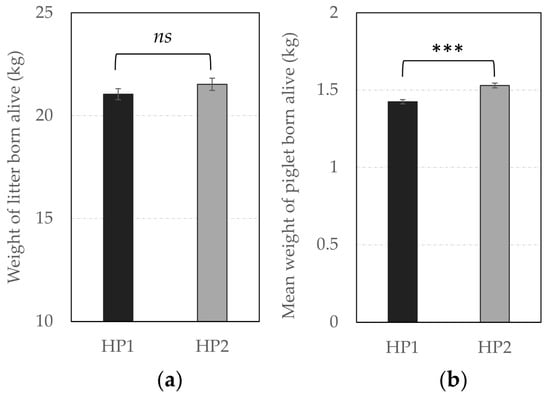 Average weight (± SEM) of (a) litter and, (b) piglets born alive (in kg) according to genetic line. *** Means differ significantly (*** p < 0.001) between genetic lines; ns—not significant.
