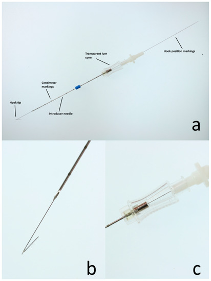 The figure shows a non-repositionable localization hook-wire needle used in the present study. (a): The hook tip securely keeps the device in place. The localization needle has centimeter markings for greater precision. The luer cone facilitates the wire insertion and allows the detection of the black mark on the wire to indicate the hook position. (b): Higher magnification of the hook tip. (c): Higher magnification of the luer cone.