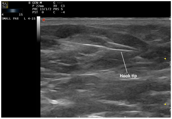 After premedication and clipping of the surgical sites, dogs were positioned in dorsal recumbency and the surgical sites were aseptically prepared. Preoperative ultrasound was performed by a board-certified diagnostic imager, imaging resident or experienced ultrasonographer. As previously reported, the SILN were located using a linear ultrasound probe using a ventral approach (4–15 MHz frequency, MyLab™EightVET Esaote, Genova, Italy, and Samsung RS80 EVO, Samsung Heathcare, Kingsbury London, UK) [9]. When ultrasonographic detection of the SILN was difficult (i.e., small size and similar echogenicity relative to perinodal fat), the SILN was sampled by fine-needle aspiration and cytologically evaluated to confirm its nature. Under ultrasound guidance, the introducer needle was inserted through the skin and advanced into or adjacent to the LN. The optimal puncture site and the direction of the wire were previously agreed with the surgeon according to the surgical approach planned. In particular, the introducer needle was inserted as perpendicular as possible to the underlying LN and as close as possible to the intended site of the surgical incision. Once the tip of the needle was placed adjacent or in the middle of the LN, the wire was gently advanced by a second operator pushing the hook out of the needle. The hook was considered deployed when a black mark on the wire was visible through the Luer cone of the needle, and its anchorage to the tissue was checked by gentle traction. After deployment the hook cannot be re-inserted in the needle. The introducer needle was carefully removed over the wire, leaving the hook anchored to the target LN and the wire was visible on the skin surface (Figure 2) (Supplementary Materials Video S1) [17].