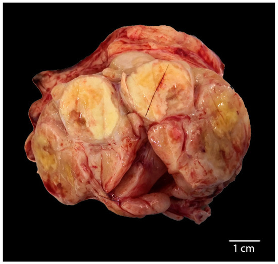 Cutting surface from the laryngeal region of the horse tumor sampled during the post-mortem analysis. A white to yellowish multilobular mass, located at the basis of the larynx, is partially ulcerated and shows multifocal central necrotic areas.