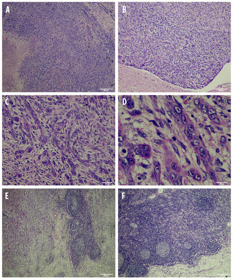 Overview of the histological findings of the squamous cell carcinoma of the larynx (A–D) and lymph node metastasis (E,F). (A): Neoplastic cells embedded in a moderate amount of fibrous collagen stroma are completely effacing the submucosa; of note, the multifocal necrotic areas within the tumor (4×, haematoxilyn–eosin, H&E). (B): neoplastic cells are variably arranged in anastomosing bands and chords occasionally forming lobules (10×, haematoxilyn–eosin, H&E). (C): Arborizing chords of variably differentiated squamous cells filling the submucosa and invading the nearby tissue (20×, haematoxilyn–eosin, H&E). (D): highly pleomorphic cell population with elongated, spindled cells often present in the invasive front of the tumor (40×, haematoxilyn–eosin, H&E). (E): few hyperplastic lymphoid follicles on the right with numerous invasive metastatic cells on the left (4×, haematoxilyn–eosin, H&E). (F): normal activated lymph node architecture scattered within the metastatic organ (4×, haematoxilyn–eosin, H&E).
