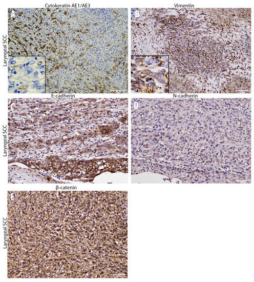 Overview of the immunohistochemical characterization of structural and adhesion molecules (A–E) of the laryngeal squamous cell carcinoma that supports an Epithelial to Mesenchymal transition (EMT) within the tumor. (A) immunohistochemistry for pan-cytokeratin AE1/AE3 displays a gradual cytoplasmic loss (insert) of this epithelial marker within neoplastic cells (10×). (B): Immunohistochemistry for vimentin reveals multifocal neoplastic cells characterized by elongated shape with a diffuse cytoplasmic expression (insert) of this mesenchymal marker (10×). (C): Immunohistochemistry displays a severe loss of membranous E-cadherin expression comparing the normal/dysplastic epithelium with the tumor cells invading the underlying tissue (10×). (D): A high number of nuclear N-cadherin immunolabeled neoplastic cells are present within the tumor (10×). (E): Immunohistochemistry reveals a moderate number of β-catenin cytoplasmic immunolabeled neoplastic cells together with numerous neoplastic cells also showing nuclear immunolabeling (10×).