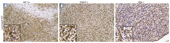 Overview of the immunohistochemical characterization of transcription factors (A–C) of the laryngeal squamous cell carcinoma that supports an Epithelial to Mesenchymal Transition (EMT) within the tumor. Immunohistochemical analysis reveals numerous nuclear immunolabeled neoplastic cells expressing HIF-1α (A, insert, 10×), TWIST-1 (B, insert, 10×), and ZEB-1 (C, insert, 10×) within the laryngeal squamous cell carcinoma.
