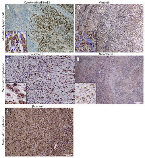 Overview of the immunohistochemical characterization of structural and adhesion molecules (A–E) of the metastatic lymph node that supports a Mesenchymal to Epithelial Transition (MET) within the tumor cells. (A) immunohistochemistry for pan-cytokeratin AE1/AE3 within the metastatic lymph node reveals a diffuse cytoplasmic (insert) immunolabeling in numerous metastatic neoplastic cells surrounded by resident lymphoid cells (4×). (B): Immunohistochemistry for vimentin reveals no positive immunolabeled metastatic neoplastic cells (insert) surrounded by positive stromal resident cells (4×). (C): Immunohistochemistry displays a gradual re-acquisition of membranous E-cadherin expression (insert) in metastatic neoplastic cells (10×). (D): A moderate number of nuclear N-cadherin immunolabeled neoplastic cells are present in the metastatic lymph node (4×). (E): Immunohistochemistry reveals a moderate number of β-catenin immunolabeled metastatic neoplastic cells showing either a cytoplasmic or a nuclear expression (10×).