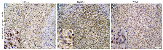 Overview of the immunohistochemical characterization of transcription factors (A–C) of the metastatic lymph node that supports a Mesenchymal to Epithelial Transition (MET) within the tumor cells. Immunohistochemical analysis reveals a moderate number of nuclearly immunolabeled metastatic neoplastic cells expressing HIF-1α (A, insert, 10×), TWIST-1 (B, insert, 10×), and ZEB-1 (C, insert, 10×) within the metastatic lymph node.