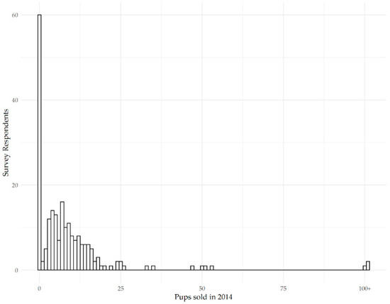 Figure 3 shows that of the 159 breeders who did have litters in 2014, 27.7% of them had five or fewer puppies, 32% had between 6 and 10 puppies, 20% had between 11 and 15 puppies, 7% had between 16 and 20 puppies, 2.5% had between 21 and 25 puppies, 3% had between 26 and 50 puppies, 2.5% had between 51 and 100 puppies, and 1.2% had over 100 puppies.