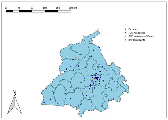 The state of Punjab, India is located in the north west part of the country (31.1471° N, 75.3412° E) and has a total geographical area of 50,362 km2 []. The climate of the area is tropical, semiarid, hot and subtropical monsoon type with cold winters and hot summers, with an average annual temperature of 21 °C (up to 0 °C in winter to up to 47 °C in summer). About two-thirds of the population of the state lives in rural areas (62.5% of 27.7 million) []. Dairy farming is an integral part of state agricultural sector comprising approximately one-third of the total agriculture sector []. The rural population of the state is traditionally engaged in livestock production. However, most of the dairy farmers in the state are smallholders [] and rear only one to four animals to generate income to supplement that from cropping, although few medium and large dairy farmers also participated in the study. Currently, Punjab is home to 69.92 million livestock including 2.47 million cattle and 4.01 million buffaloes []. Milk constitutes 80% of the total output from the livestock sector in the state, with Punjab currently producing 12.6 million tons of milk per year [], 55% of which is sold as fluid milk [].