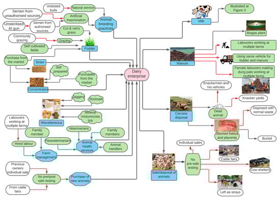 Value chains describe the process or activities involved in procuring, producing and marketing of products. The exploration of value chains is an effective tool that has been frequently used in India and elsewhere to identify the constraints related to improving the efficiency and scale of dairy production. It also helps in mitigating the market risks []. Ideally, a value chain analysis should be a critical evaluation of the chains involved, and the actors involved in various components of the industry, and their inter-relationships [,]. It provides information about the flows of inputs to the production system and outputs from the system, thus providing a holistic view of the industry []. Value chains also allow the identification of weak points or “risk nodes” in the system that make the system potentially vulnerable to diseases or other hazards. Identification of such nodes can give insights into approaches that could be used to control diseases []. Value chain mapping has been successfully used to understand various livestock production systems and to identify risk nodes for disease spread in several countries including Ethiopia, the United States, Kenya and Sri Lanka [,,,]. However, studies of the value chains in the dairy sector in India are focused primarily on the institutionalized advancements in the milk marketing system and often do not explore the concerns regarding livestock procurement, health, nutrition and the veterinary care structure inputs.