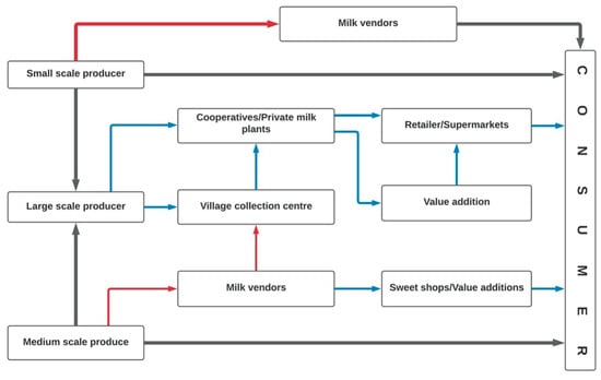 Flow diagram of the output chain of milk through various marketing channels as created during the study of dairy value chain in Punjab, India during 2018–2019. Blue and red color arrows indicate low and high risk of disease transmission, respectively.