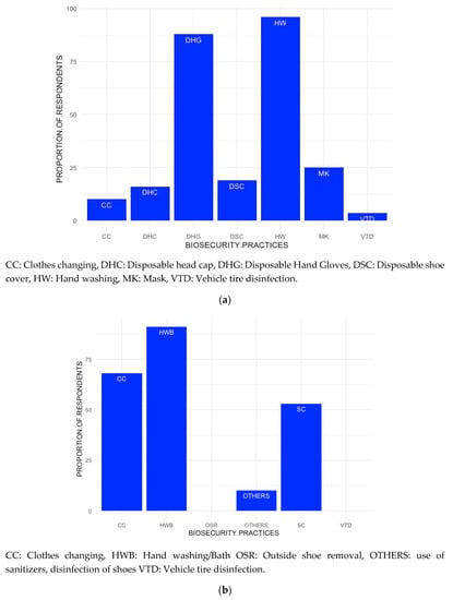(a) The proportional distribution of the different biosecurity practices adopted by the veterinary professionals (veterinarians and paraveterinarians) while moving from farm to farm based on the responses received during dairy value chain study conducted in Punjab, India during 2018–2019; (b)the proportional distribution of the different biosecurity practices adopted by the veterinary professionals (veterinarians and paraveterinarians) on returning home from farm visits based on the responses received during dairy value chain study conducted in Punjab, India during 2018–2019.