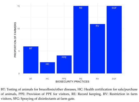 This study also highlights that farmers prefer paraveterinarians to veterinarians because the former are usually more accessible, as they live in closer proximity (80% of the paraveterinarians resided in rural areas compared to 60% of the veterinarians), charge lower fees and can provide services at the farmers’ doorstep. The paraveterinarians are not trained or legally permitted to perform many veterinary interventions. It is likely that paraveterinarians would also be responsible for spread of infections between animals and farms. This is in addition to poor outcomes for the animals and the farmers in the long run. Proch, et al. [] demonstrated that compared to the veterinarians, the paraveterinarians and animal attendants are more likely to be Brucella infected as the latter attend interventions more frequently, lack adequate skills and are also not fully aware of the risks involved. The prevalence of brucellosis infection in veterinary practitioners including veterinarians as reported elsewhere reinforces the finding that the necessary biosecurity measures are inadequate [,,]. While the role of paraveterinarians in delivering veterinary services is crucial, especially in the rural areas as in many other developing countries, there needs to be a clear demarcation of their role from that of veterinarians. Alternatively, their veterinary training must be scaled up to include biosecurity, disease management and infection control along with the importance of the use of personal protection. Provision of PPE for veterinary use, training of personnel for its use and reinforcing its regular use by practitioners also demands serious attention on the part of policy makers, extension services and state veterinary department alike.