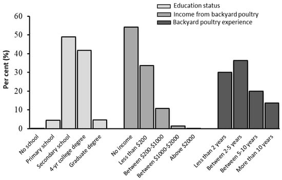 Most of the respondents were younger than 50 years old (90%) and had been educated beyond secondary school level (95.4%). When participants were asked how much income they earned from backyard poultry farming, 54% stated that they did not raise poultry for the purpose of generating income, and the rest of the participants stated that they earned 200 USD/month and more from backyard poultry farming (