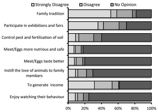 Figure 3). Moreover, most of the respondents stated that they enjoyed watching the behavior of the poultry (81.8%), keeping poultry instilled a love of animals in family members (78.1%), and they helped to control pests and fertilized the soil in the garden (69.4%). Generating income from backyard poultry, participating in exhibitions and fairs, and family tradition was the less important to the participants. In summary, these findings confirmed that the participants perceived their poultry as pets and/or thought that the meat and eggs they obtained from their animals were healthier and better quality than commercial ones. Also, when the relationship between the education status of participants and the reasons for raising poultry in backyards was examined according to the chi-square analysis, it was concluded that respondents with higher education tended to raise poultry to obtain healthier, tastier and nutritious meat and eggs for their families (χ