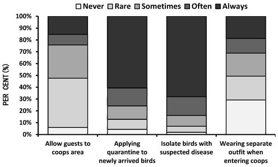Regarding biosecurity measures for backyard poultry, respondents were asked how often they implemented any biosecurity practices, which were evaluated on a Likert preference scale (