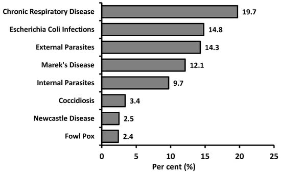 Escherichia coli infections (14.8%), external parasites (14.3%), Marek’s disease (12.1%) and internal parasites (9.7%) were reported by the participants as second-level diseases. Coccidiosis, Newcastle disease and fowl pox were the other diseases identified by the respondents. Similar to the findings of Crespo and Senties-Cue [