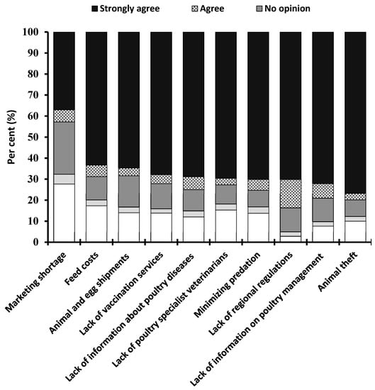 Figure 6). The vast majority of the respondents agreed with the following challenges: lack of regional regulations for backyard poultry (83.68%), animal theft incidents (79.89%), lack of information on poultry management (79.07%), minimizing predation (75.23%), lack of information about poultry diseases (74.95%) and lack of poultry specialist veterinary services (72.67%). The other important challenges were reported as the lack of vaccination services for small flocks (72.12%), feed costs (68.74%), animal and egg shipments (68.37%) and a shortage of marketing (62.98%). Moreover, the respondents’ living environment had a significant impact on the challenges they were facing (