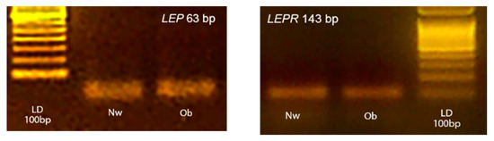 Representative photographs of typical 2% agarose ethidium bromide stained gels. The presence of the expected bp products yielded after RT-PCR using primers for target LEP and LEPR are showed. Lane LD is the kilobase DNA marker, lane Nw (Normal-weight) and Ob (Obese) identify two skin samples belonging to the two experimental groups.
