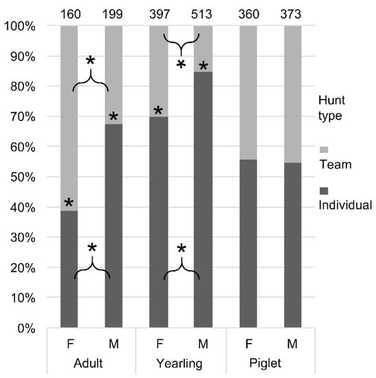 The results of post-hoc tests are presented in Table S1 in Supplementary Materials. We found that significantly more adult males were shot during individual hunts than during team hunts (Figure 1). The opposite was found for adult females. Male and female yearlings, however, were shot significantly more often during individual hunts than during team hunts. No significant differences were observed for piglets and hunting method.