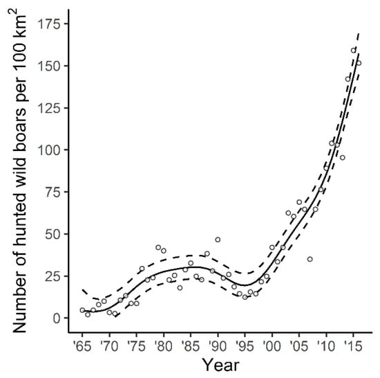 During the study period, the number of culled wild boar increased non-linearly (Figure 2, edf (effective degree of freedom) = 4.5, F = 90.44, p < 0.001)—an increase was apparent from 1965 until 1985, followed by a decline during the early 1990s. Since 1998 there has been a large increase in the number of culled wild boar.