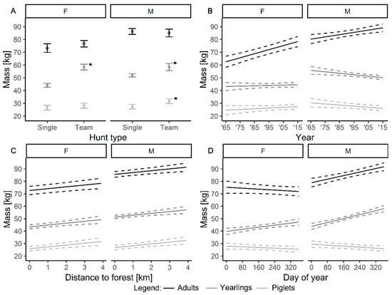We found interactions of hunting method, sex, age and the mass of culled wild boar. Post-hoc Tukey tests indicated that during the team hunts the mass of culled wild boar was significantly higher for yearling females and males and male piglets (Figure 3A, for each of these comparisons significances at p < 0.03) than from individual hunts.