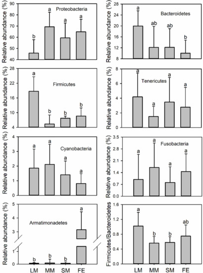 Relative abundances of dominant bacterial phyla of Odontolabis fallaciosa across treatments. Error bars denote standard deviation; different letters represent significant differences from a one-way ANOVA with Tukey’s honestly significant difference (HSD) post-hoc testing (p < 0.05). LM: large male; MM: medium-sized male; SM: small male; FE: female.