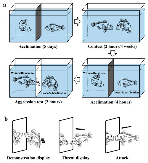 For the long-term contest, the fish in the remaining 12 glass tanks were allowed to interact continuously for four weeks. Each pair in a tank were observed for 5 min daily to check for the dominance–subordination relationship. Individuals were identified based on their skin patterns and swimming tracks, and only the fish with a consistent social hierarchy was used to conduct the aggression test and then sampled for physiological analysis (Figure 1a).