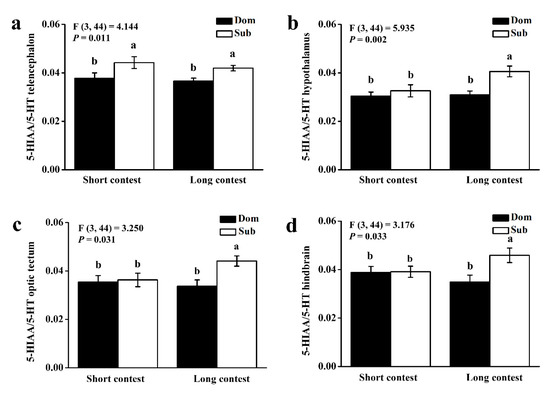5-hydroxyindoleacetic acid (5-HIAA)/5-hydroxytryptamine (5-HT) ratios of (a) telencephalon, (b) hypothalamus, (c) optic tectum, and (d) hindbrain in dominant (Dom) and subordinate (Sub) black rockfish from short-term contest to long-term contest. Different letters indicate significant differences among these four groups, which were detected by one-way ANOVA (p < 0.05). Values are mean ± S.E. (n = 12).