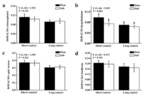 The ratio of DOPAC/DA in the hypothalamus was significantly higher in dominant individuals than in subordinate individuals in the short-term contest (p < 0.05), whereas it is similar in all brain regions between subordinate individuals and dominant individuals in the long-term contest (p > 0.05; Figure 3).