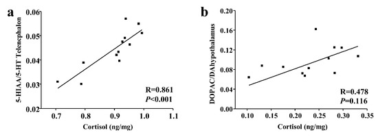 As the cortisol levels were different between subordinate individuals and dominant individuals only in the short-term contest, while the number of aggressive acts was different only in long-term contest. We tested the relationships between plasma cortisol and brain monoaminergic activity in short-term contests and relationships between the mean number of aggressive acts and brain monoaminergic activity in long-term contest. Specifically, in short-term contests, cortisol levels had a significant positive correlation with the telencephalon 5-HIAA/5-HT ratios in subordinate individuals (p < 0.001; Figure 4).