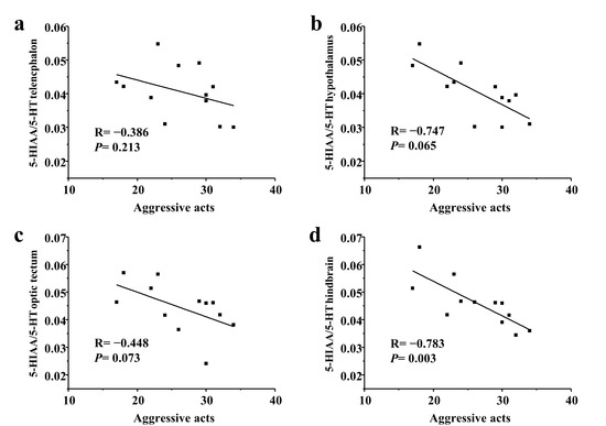 In a long-term contest, the number of aggressive acts had a significantly negative correlation with the hindbrain 5-HIAA/5-HT ratios in subordinate individuals (p < 0.05; Figure 5).