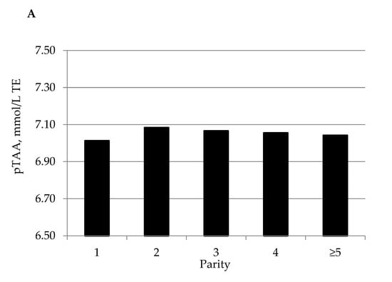 Milk pTAA averaged 7.16 mmol/L TE and ranged from 5.46 to 8.76 mmol/L TE (Table 1). The average pTAA was maximum and minimum in second- (7.19 mmol/L TE) and first-parity cows (7.13 mmol/L TE), respectively. These values are consistent with results reported by Niero et al. [18], who measured TAA on different types of commercial milk, and slightly greater than values obtained by Niero et al. [12], who measured TAA using the reference spectrophotometric method on 1249 milk samples of HO cows.