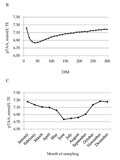 All the fixed effects included in the statistical model (i.e., parity, DIM, and calendar month and year of sampling) were significant in explaining the variation of milk pTAA. The pTAA differed (p < 0.001) between first- (7.01 mmol/L TE) and second-parity cows (7.08 mmol/L TE; Figure 1). In general, pTAA slightly decreased from second parity onward. The same trend was observed by Franzoi et al. [20] for CP percentage, as well as for α-casein, β-casein, κ-casein, and α-lactalbumin. This comparison supports the hypothesis that protein, CN, and whey proteins contribute to milk TAA [8,9,10]. Milk pTAA decreased from 7.22 to 6.83 mmol/L TE when moving from 10 to 40 DIM and increased thereafter up to 7.18 mmol/L TE at the end of lactation (Figure 1). This trend is opposite to that of milk yield, leaving room for the hypothesis of a dilution effect. In fact, the lactation curve of milk pTAA (Figure 1) resembled that of CP percentage and its fractions [20] and fat percentage [21]. Considering the effect of month of sampling, milk collected in summer had lower pTAA than milk sampled in other seasons. In particular, the lowest pTAA was obtained for milk collected in June (6.77 mmol/L TE) and the greatest for milk collected in November (7.25 mmol/L TE), December and January (7.27 mmol/L TE). The impact of month of sampling on milk pTAA could be the result of management practices throughout the year, like the practicing of extensive pasture from late spring to the end of summer, that has been associated to an overall reduction of protein [20] and fat [21] content in bovine milk.