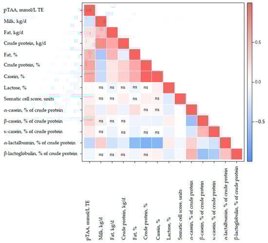 Pearson correlations (p < 0.001) between sires’ estimated breeding value (EBV; n = 442, accuracy ≥ 0.65) of bovine milk predicted total antioxidant activity (pTAA) expressed as mmol/L of Trolox equivalent (TE) and EBV of other traits. ns = not significant.