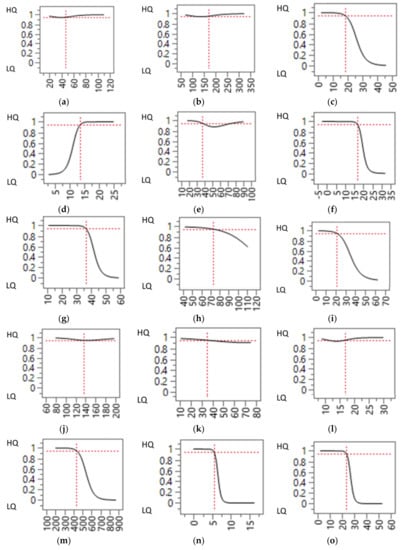 Profile graphs of the neural network model for all the pre-slaughter variables presented in Table 2. For each graph, the name of the variable plotted on the x-axis is indicated below the figure. (HQ = High quality cluster; LQ = Low quality cluster). Variable names highlighted in bold character indicate statistically significant differences (p < 0.05) between clusters, as presented in Table 2. (a) Loading duration, min. (b) Pigs loaded per hour, n. (c) Irregular behaviors at loading, %. (d) Waiting time at the farm, min. (e) Journey duration, min. (f) Ambient temperature, °C. (g) Distance traveled, km. (h) Average vehicle speed, km/h. (i) Waiting time at slaughterhouse, min. (j) Total journey duration, min. (k) Total waiting time on the truck, min. (l) Unloading duration, min. (m) Pigs unloaded per hour, n. (n) Irregular behaviors at unloading, %. (o) Total irregular behaviors. (p) Lairage duration, min. (q) Transport + lairage duration, min. (r) Stable (unmixed) groups, odds ratio. (s) On-departure (at farm) score, pts. (t) Transport score, pts. (u) Slaughter score, pts. (v) TSWI, pts.