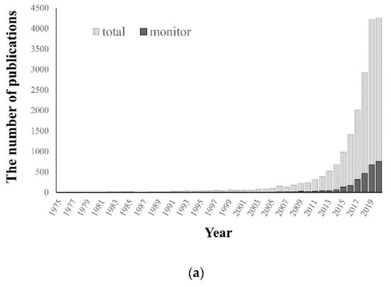 We browsed the Web of Science (http://www.webofknowledge.com) to search for articles that contained the topics of “unmanned aerial”, “unmanned aircraft”, “remotely piloted aerial”, “remotely piloted aircraft”, or “drone” but not “honey bee” in the title, abstract, and keywords. Yielding 19,399 such results from 1975 in November 2020, we chose these to wholly include the broad term UAS and formally accepted term RPAS [16]. When we included “drone”, we excluded the term with “honeybee” to reduce any confusions because drone is also used to indicate a male honeybee, Apis mellifera. The record of published articles to date is almost exponentially increasing and records increased by around 40% in the five most recent years (Figure 1a).