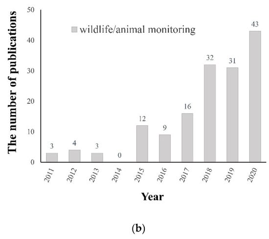 On the other hand, Johnston [39] reviewed RPAS applications within a subdiscipline, i.e., marine science and conservation, by selecting a specific environment type. As another example of selecting an analysis target narrowed by the environment type, Verfuss et al. [40] also reviewed RPAS applications for the detection and monitoring of marine fauna. Mangewa et al. [41] analyzed previous studies applying the RPAS techniques to community wildlife management areas in Tanzania. Burke et al. [42] focused on the optimization of RPAS-based thermal imaging strategies, considering the thermal effects of ground and atmosphere, occlusion by vegetation, and effective flight height for accurate image acquisition and identification of animals of interest. Wang et al. [43] reviewed previous wild animal survey studies using satellites, manned aircraft, and RPAS and focused on the data specifications, animal detection methods, and detection accuracy.