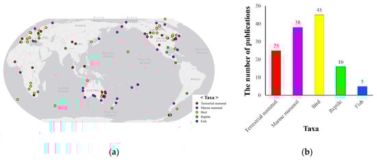 Global areas with RPAS wild animal monitoring and the number of publications. (a) Areas where RPAS monitoring has been applied and (b) the number of publications by animal taxa.