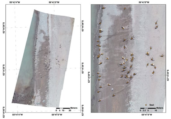 Penguins, as colonial birds, nest close to each other in open space and this makes it difficult for researchers to estimate their population. Ratcliffe et al. [95] operated a UAV to survey a gentoo penguin (Pygoscelis papua) colony at Volunteer Point, East Falkland in sub-Antarctic islands. At 30 m height above ground, the images of penguins clearly revealed individuals, and 1021 active nests were found in the mosaicked images covering the whole colony. Similarly, Goebel et al. [96] took aerial photographs of the gentoo and chinstrap penguin (Pygoscelis antarctica), Antarctic fur seals (Arctocephalus gazelle), Weddell seals (Leptonychotes weddellii), and leopard seals (Hydrurga leptonyx) at Cape Shirreff, Livingston Island, South Shetland Islands.